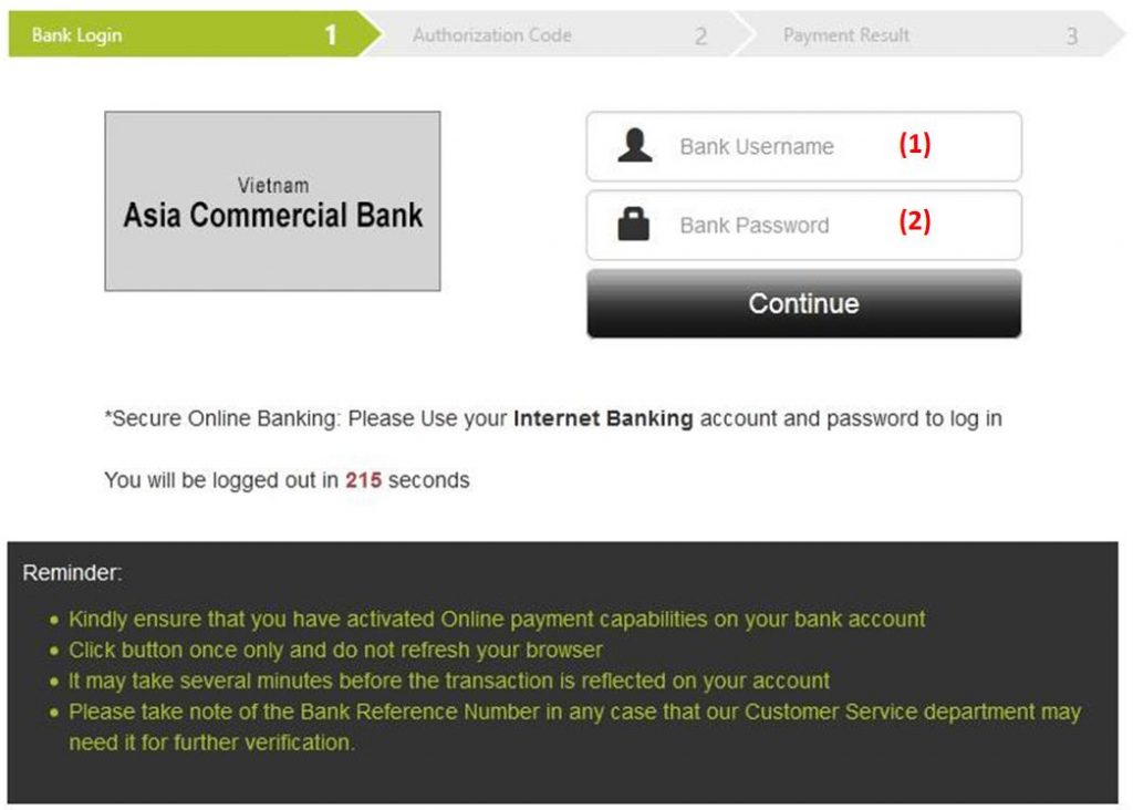 = > Saat memasukkan nama pengguna dan kata sandi yang benar, klik “Lanjutkan”. Di sini saya memilih bank ACB.