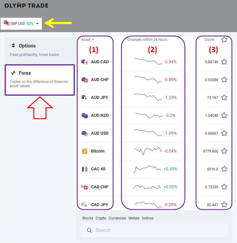 Karena akun Olymp Trade dibagi untuk bertrading Opsi dan Forex, Anda memerlukan beberapa langkah kecil untuk mengubah Forex dengan mengklik kotak di bawah ikon Olymp Trade.