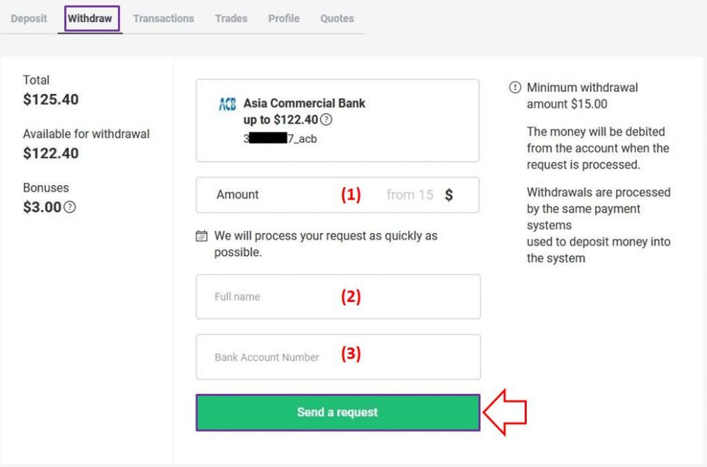Jumlah minimum depositnya adalah sebesar $15. Setelah memilih bank, masukkan jumlah yang ingin Anda deposit. Kemudian klik Deposit.
