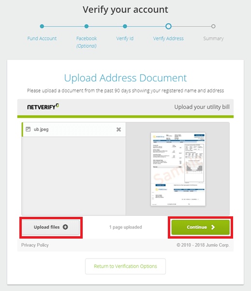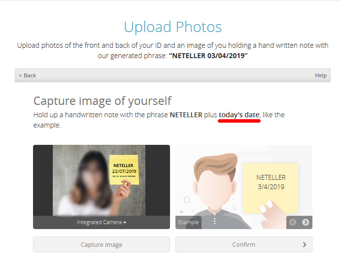 Terutama, jika Anda menautkan, dalam langkah Konfirmasi Verifikasi, Anda hanya perlu dua foto kartu ID, SIM atau Paspor. Jika Anda tidak menautkannya, Anda harus memasukkan foto Anda yang sedang memegang selembar kertas catatan yang diminta Neteller.