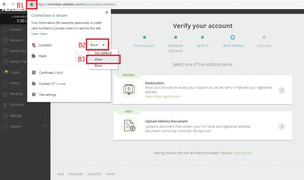 - Geolokasi: Nyalakan lokasi pada browser Neteller untuk mengecek lokasi Anda pada Google Map untuk verifikasi otomatis. Sangat cepat. Tapi ingat Anda harus menggunakan komputer/laptop yang dekat alamat yang Anda daftarkan untuk akun Anda.