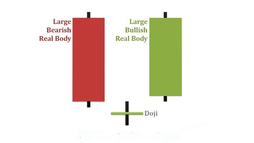 Doji (kandil kedua) menandai penggabungan dan kebimbangan harga. Pada beberapa kasus, kandil kecil muncul, bisa jadi kandil berwarna merah atau hijau.