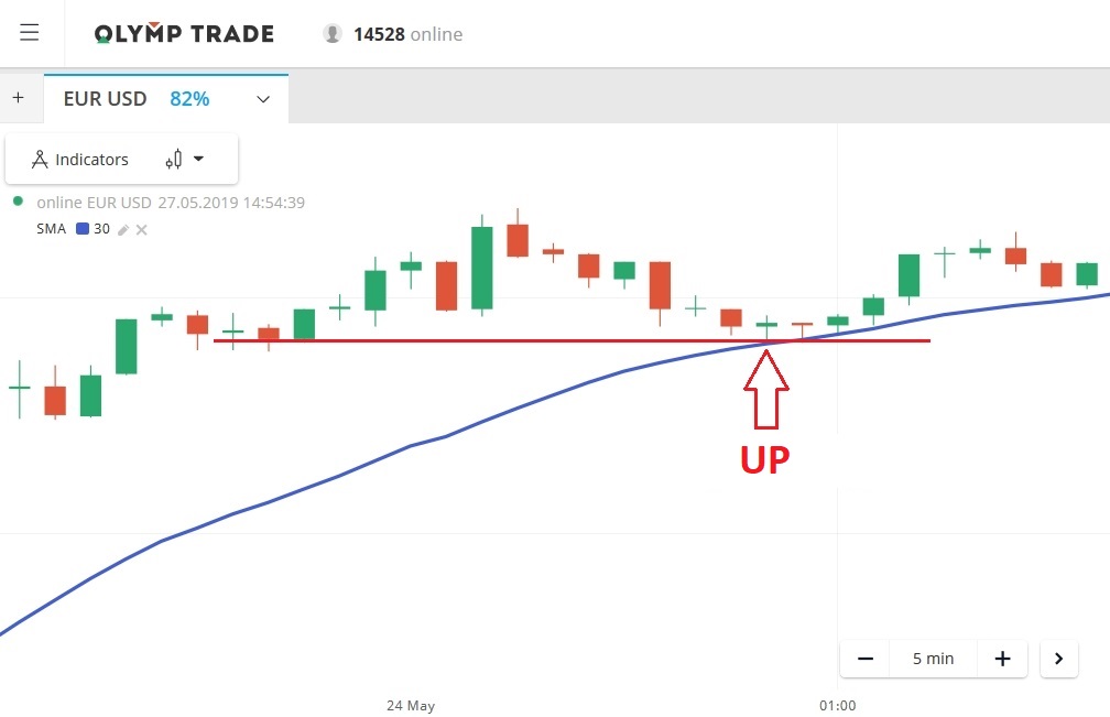 bertrading Up saat: Harganya turun ke SMA30 + menyentuh level (Support/Resistance) = bertrading Up dengan waktu kadaluwarsa di dalam kandil tersebut.