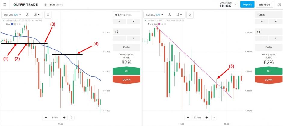 Opsi kelima: Berdasarkan hal itu opsi ini berada dalam grafik 10 menit. Harganya meningkat dan mematahkan downtrend + menyentuh zona resistance = bertrading Down.