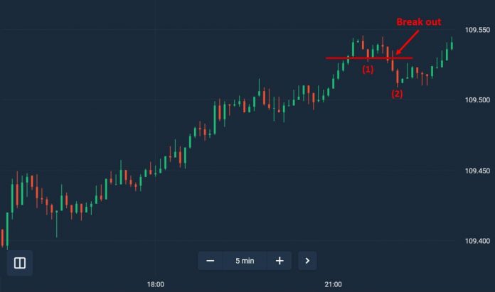 Opsi 1: Harga menembus resistance dan terus naik. Sinyalnya adalah kandil uji retracement => bertrading Up (bertaruh kandil selanjutnya berwarna hijau) => Menang