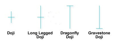 Doji dalam bahasa Jepang artinya tidak ada perubahan. Jadi kandil Doji adalah dimana harga pembukaan dan harga penutupan hampir tidak berubah.